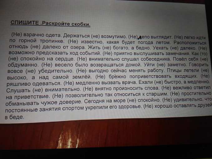 Невзрачно одета. Держаться невозмутимо. Нелепо выглядит. Нелегко идти по горной тропинке. Неизвестно, какая будет погода летом. Расположиться отнюдь не далеко от озера. Жить не богато, а бедно. Уехать недалеко. Выполнить не хуже других. Не пора ли сделать перерыв? Невозможно предсказать ход событий. Неприятно выслушивать замечания. Говорил не слишком убедительно. Поступил не по-товарищески. Мне было вовсе не смешно. Неоткуда ждать помощи. Невдалеке раздался шорох. Как-то очень неспокойно на сердце. Отнюдь не внимательно слушал собеседника. Повёл себя несколько необдуманно. Невесело было возвращаться домой. Уйти незаметно. Говорить вовсе не убедительно. Невыгодно сейчас менять работу. Птицы летели не высоко, а над самой землёй. Говорил небыстро, но эмоционально. Нам не жаль его. Незачем спорить со старшими. Ты поступил не лучше, в высшей степени некрасиво. Сейчас не время спорить. Решили сделать не по-моему. Невзначай спросил об этом. Небрежно поприветствовать входящих. Неряшливо одеваться. Немедленно вызвать врача. Ехали не быстро, а медленно. Слушать невнимательно. Невнятно произносить слова. Невежливо ответил на приветствие. Крайне непозволительно так относиться к старшим. Непростительно обманывать чужое доверие. Сегодня на море ничуть не спокойно. Неудивительно, что постоянные занятия спортом укрепили его здоровье. Не надо оставлять друзей в беде.